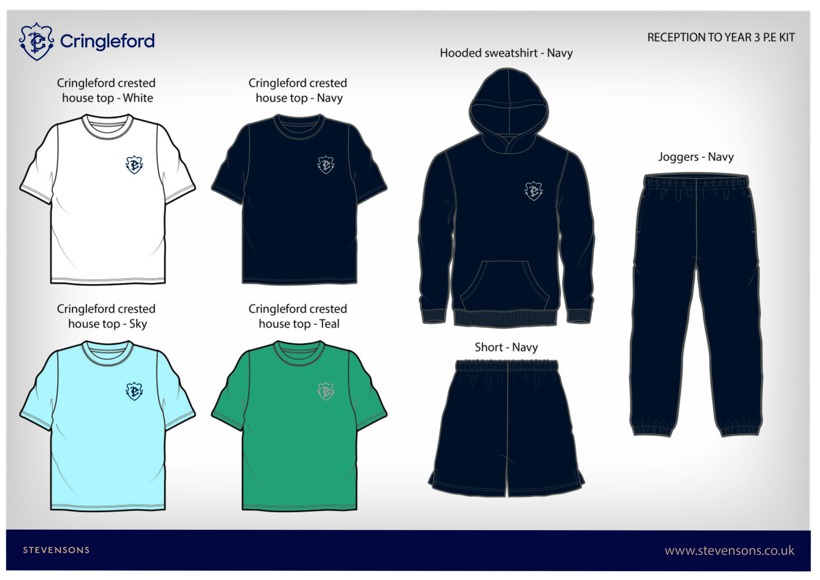 Our PE kit is made up of a house colour sports top with blue shorts and/or tracksuit bottoms and a crested hooded top.