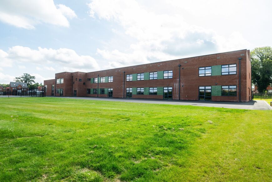 The new school has two storeys with two classrooms for each year group. There is car parking for staff and visitors, including electric-charging spaces. Its design and layout has been carefully considered to reduce net carbon. The new building has solar panels, air-source heat pumps, natural ventilation and an all-electric kitchen.